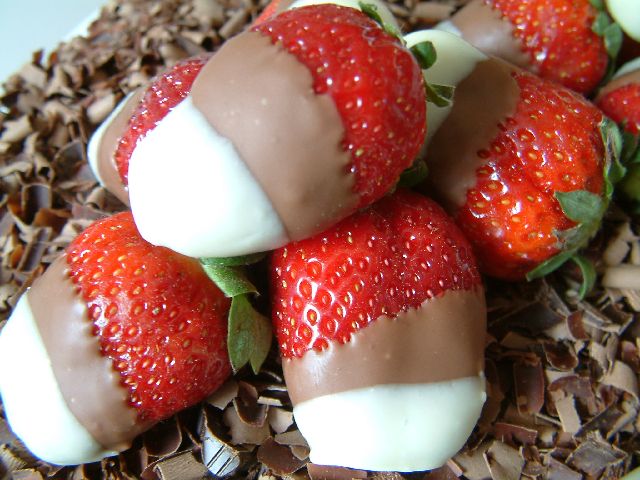 Close up image of fresh strawberries dipped in milk and white chocolate.