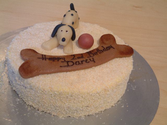 The cake is covered with desiccated coconut and decorated with a marzipan dalmatian dog and a large marzipan bone.