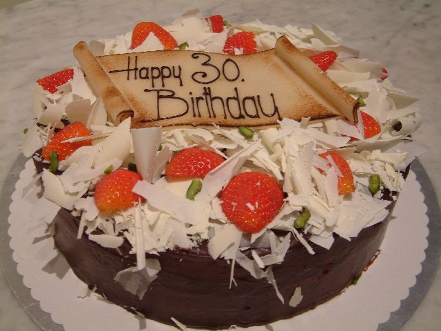 A chocolate truffle cake covered with dark chocolate trufflecream ganache. The cake is topped with white chocolate shavings and fresh strawberries (halved).