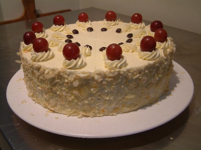 A simply decorated cake with a smooth buttercream top, sliced almonds on the side, decorated with piped cream, chocolate and cherries.