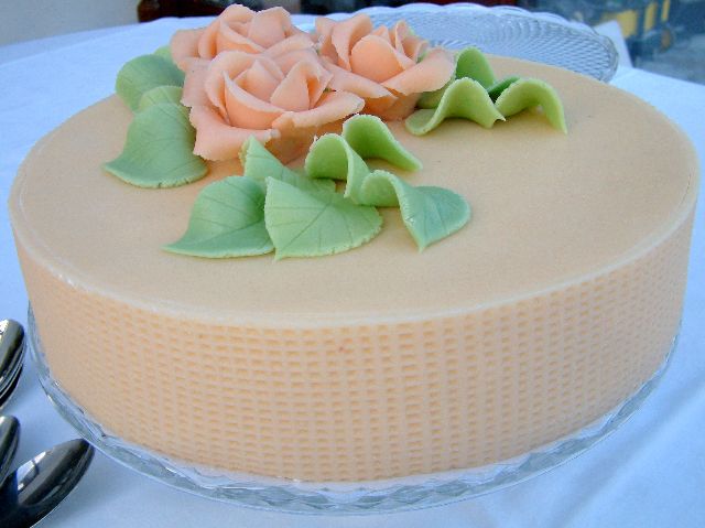 The entire cake is sealed with rolled marzipan (smooth on the top, grid textured on the side). The cake is decorated with marzipan roses and leaves.
