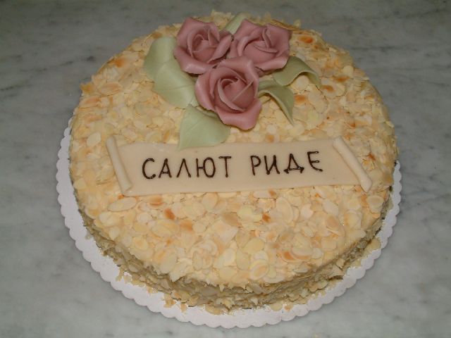 A simple cake covered with thinly sliced almonds, marzipan roses and petals, and a Russian greeting.