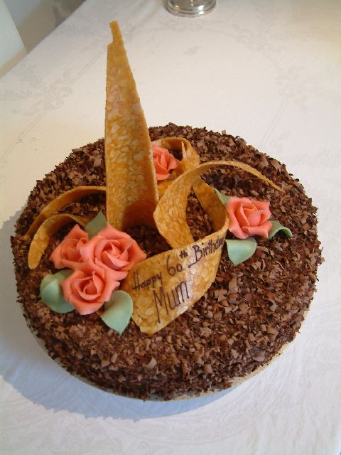 A dramatic cake covered with shaved dark chocolate and decorated with towering krokant spikes, krokant swirls and marzipan roses.
