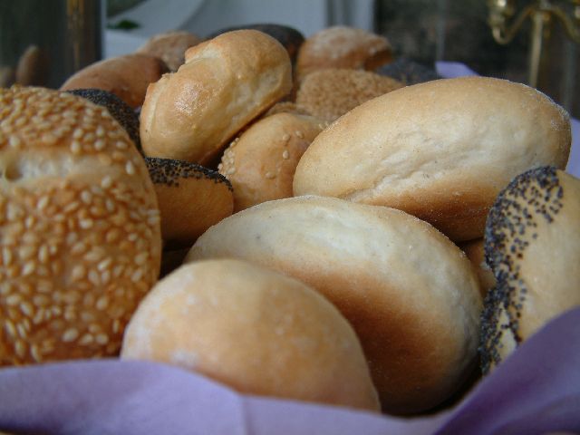 A basket with a selection of bread rolls - some covered with poppy seeds, others with sesame seeds.