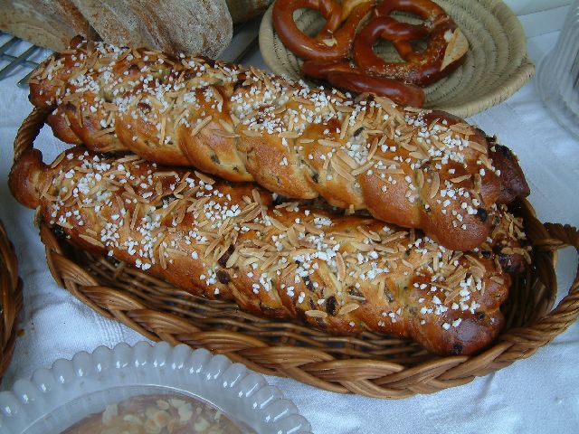 Hefezopt, a sweet yeast dough bread with raisins, topped with 'hale' sugar and almond sticks.