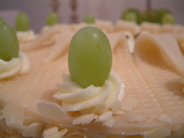 Textured marzipan segments mark the top of the cake into slices. Each slice is decorated with cream, chocolate and a green grape. The side of the cake is covered with thinly sliced almonds.