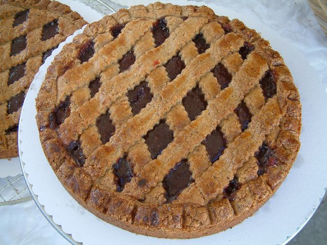 Linzertorte: an Austrian speciality cake with a sweet shortcrust dough flavoured with lemon, almonds, hazelnuts and spices. The cake is filled with raspberry jam, topped with a lattice of shortcrust then baked.