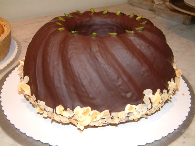 A German style spiced cake, baked in a ring, covered with melted chocolate and almonds.
