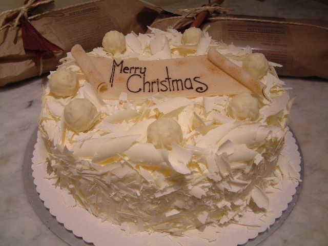 An Christmas cake completely covered in white chocolate shavings and handmade champagne truffles (dipped in white chocolate).