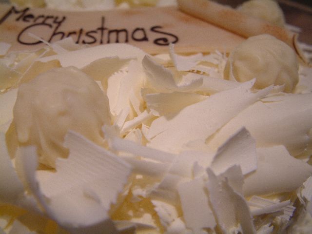 Close up photograph of the top of a Christmas cake showing white chocolate champagne truffles nestling amongst white chocolate shavings.