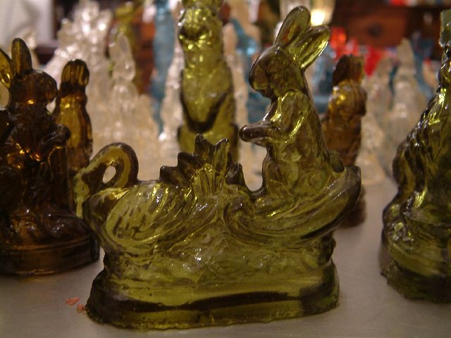 A green sugar cast of a swan pulling along a rabbit sat on a shell carriage