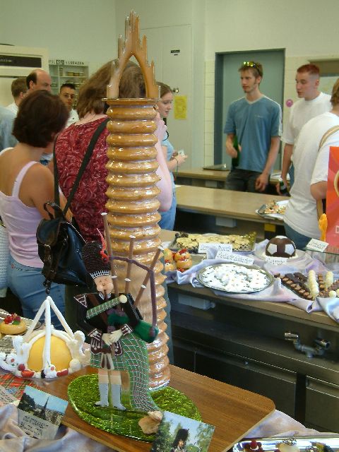 A bagpiper made from moulded sugar, stood next to a 120 cm tall baumkuchen.