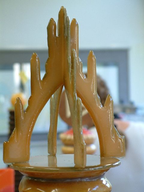 A close up picture of the top of the baumkuchen. The top is made moulded from sugar and is based on the top of the Wallace Monument, Stirling.