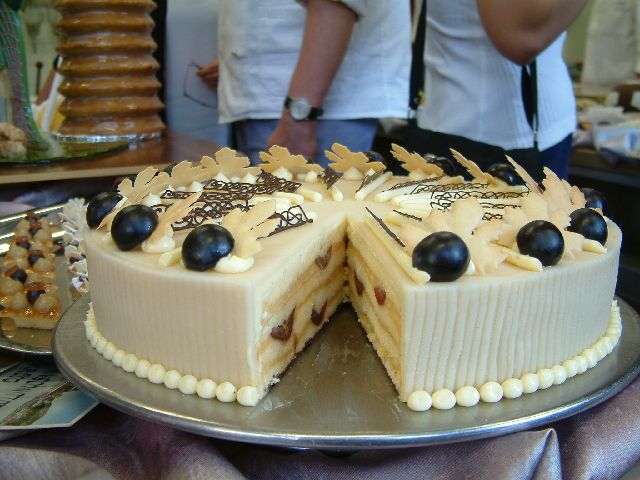 An intricately decorated winecream cake with black grapes.