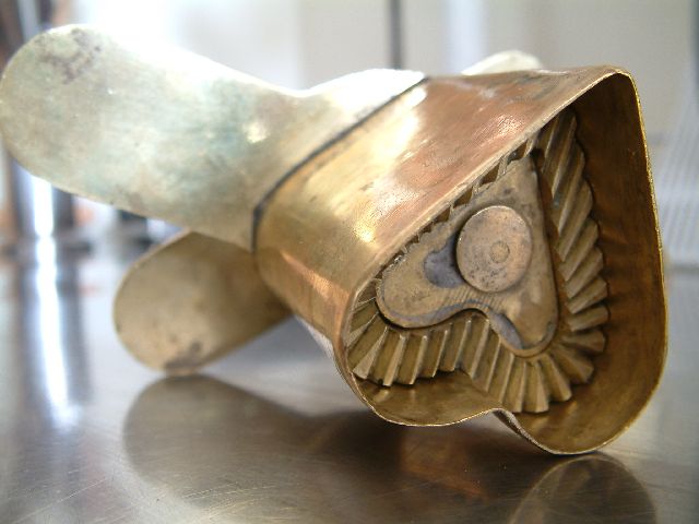 The antique Königsberger marzipan mould we use to form the marzipan. The depth of the heart-shaped indent and overall height are completely adjustable.