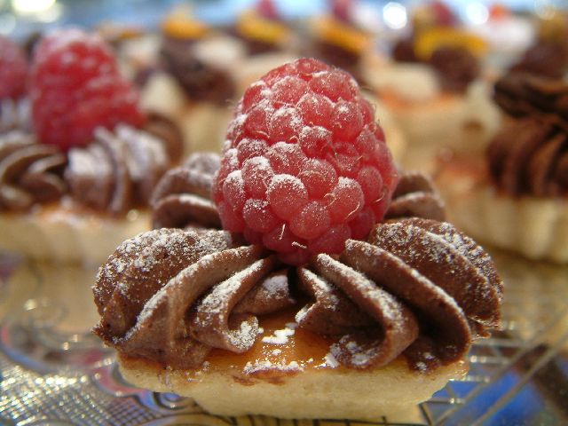A petit four with square frangipan base, piped chocolate ganache, topped with a fresh raspberry and icing sugar.