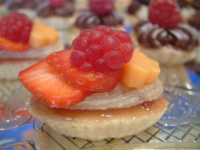 A petit four with frangipan base, glazed with fruit syrup, topped with a selection of fresh fruits.