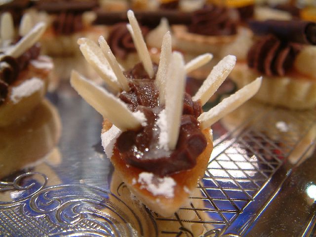 A petit four with fragipan base, piped chocolate ganache and flaked almonds.