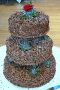 A beautiful 3-tier cake covered in coarse white-shaved chocolate and decorated with deep red marzipan roses and marzipan leaves. Each tier is a different type of cake.