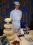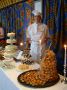 In the foreground is a croquembouche (profiterole tower) wrapped with spun sugar. In the background are sample slices of wincream cake, handmade chocolates and a four tier wedding cake covered with white chocolate shavings.