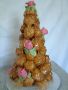 A 40 profiterole, free standing crouquembouche decorated with marzipan roses and spun sugar.