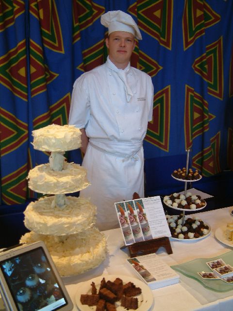 Standing on the table in front of Falko is a four tier wedding cake totally covered with coarsely shaved white couverture chocolate.