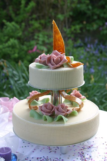 Two-tier wedding cake, covered with a thin layer of natural marzipan, decorated with mauve marzipan roses and dramatic krokant swirls and spikes.