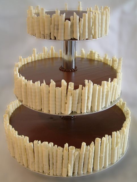 Three tier wedding cake covered with smooth dark chocolate ganache and decorated round the sides with vertical white chocolate 'cigars.' The image shows the cake before being further decorated with fresh flowers.