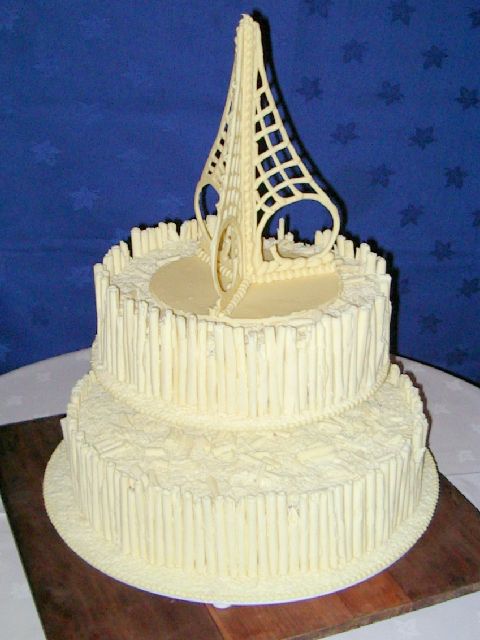A dark chocolate trufflecream cake covered on the sides with white chocolate 'cigars' and and shaved white chocolate on the cake tops. The height of the cake is extended with a dramatic piped white chocolate crown.
