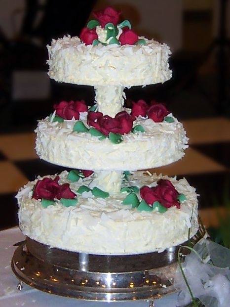 A beautiful 3-tier cake covered in coarse white-shaved chocolate and decorated with deep red marzipan roses and marzipan leaves. Each tier is a different type of cake.